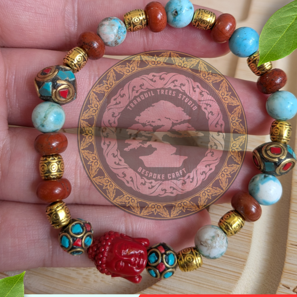 Bring balance, grounding, and spiritual focus into your everyday life with this handmade gemstone bracelet. Featuring the earthy strength of Red Jasper, the calming energy of dyed Blue Howlite, and a vibrant Coral Red Buddha bead, this bracelet is more than an accessory—it’s a wearable reminder of mindfulness and peace.