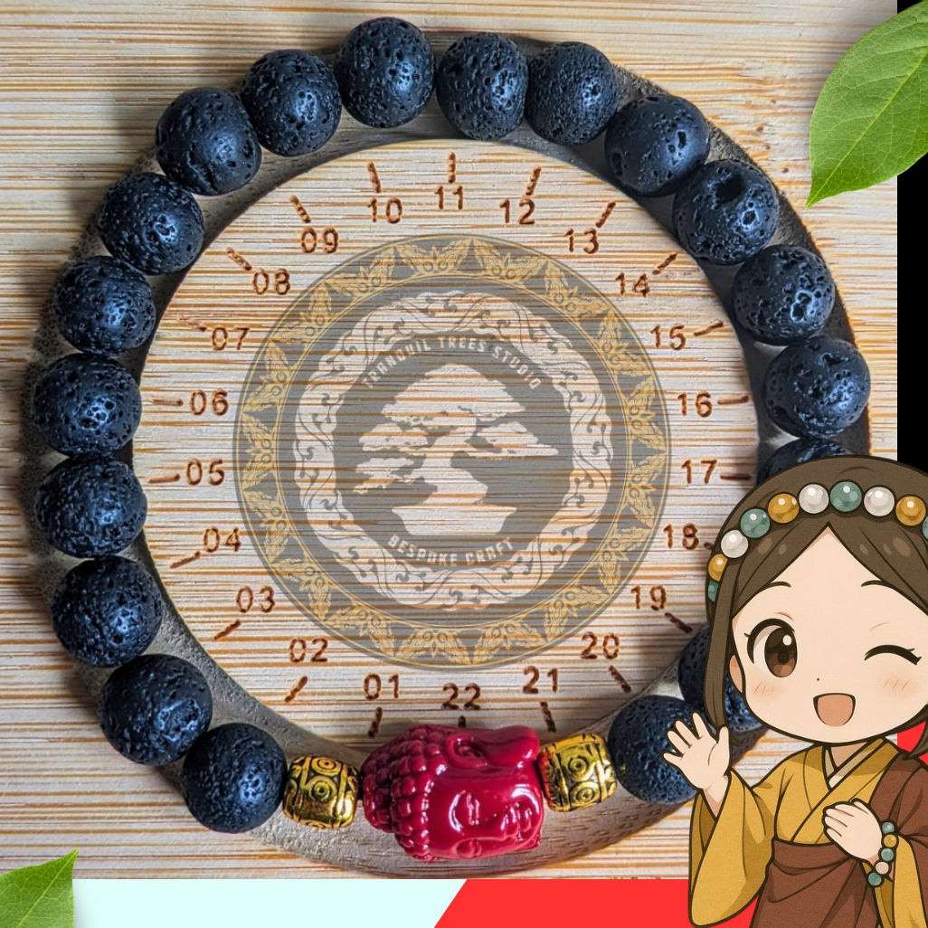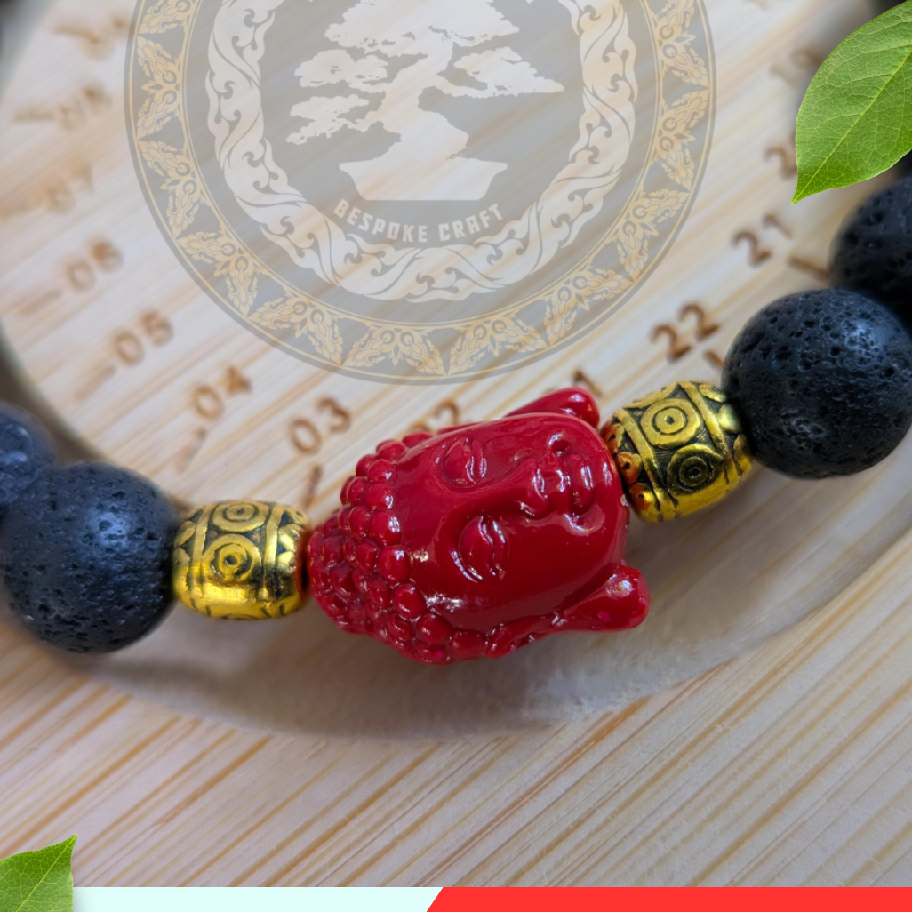 Bring balance, protection, and a touch of bold style into your life with this handmade lava stone bracelet featuring a striking red imitation coral Buddha bead accented with antique-style golden brass spacers.